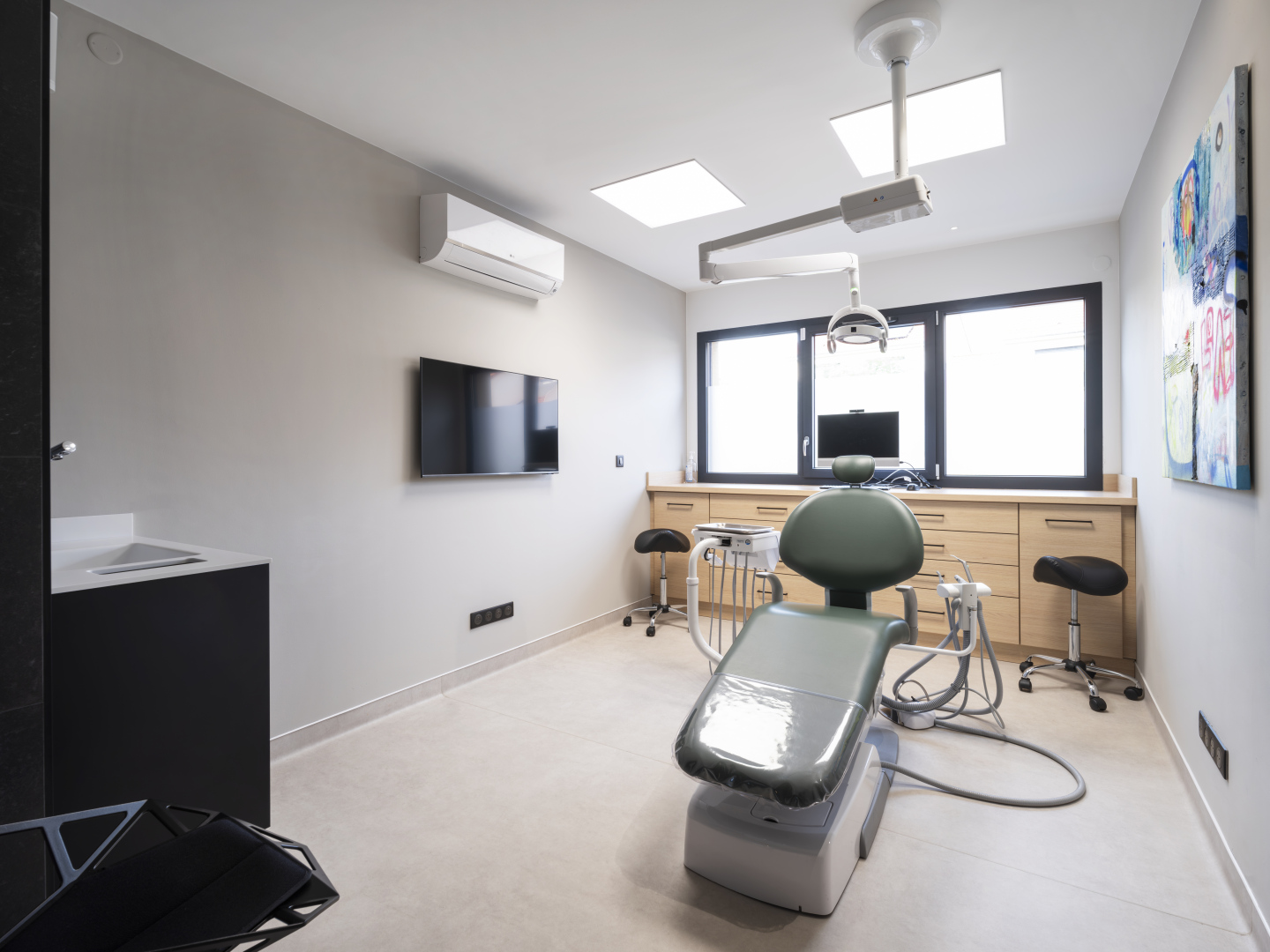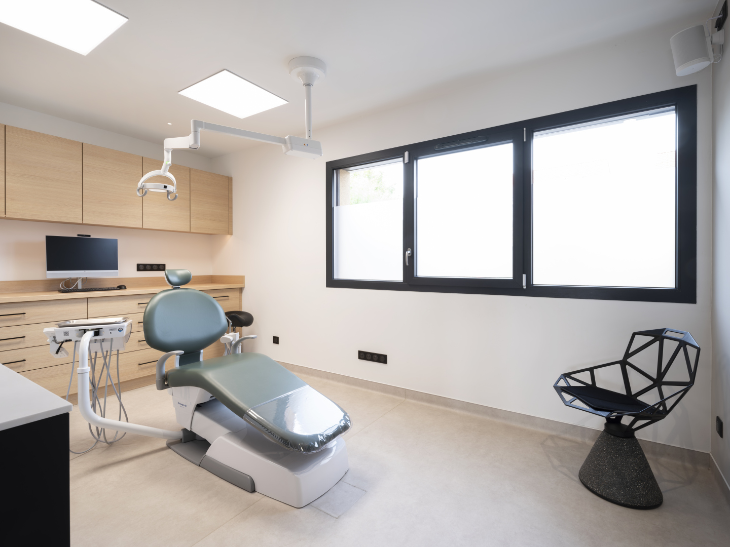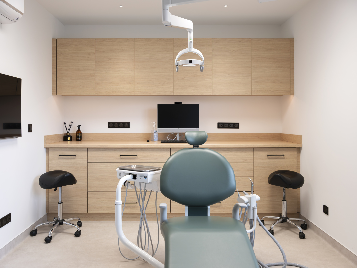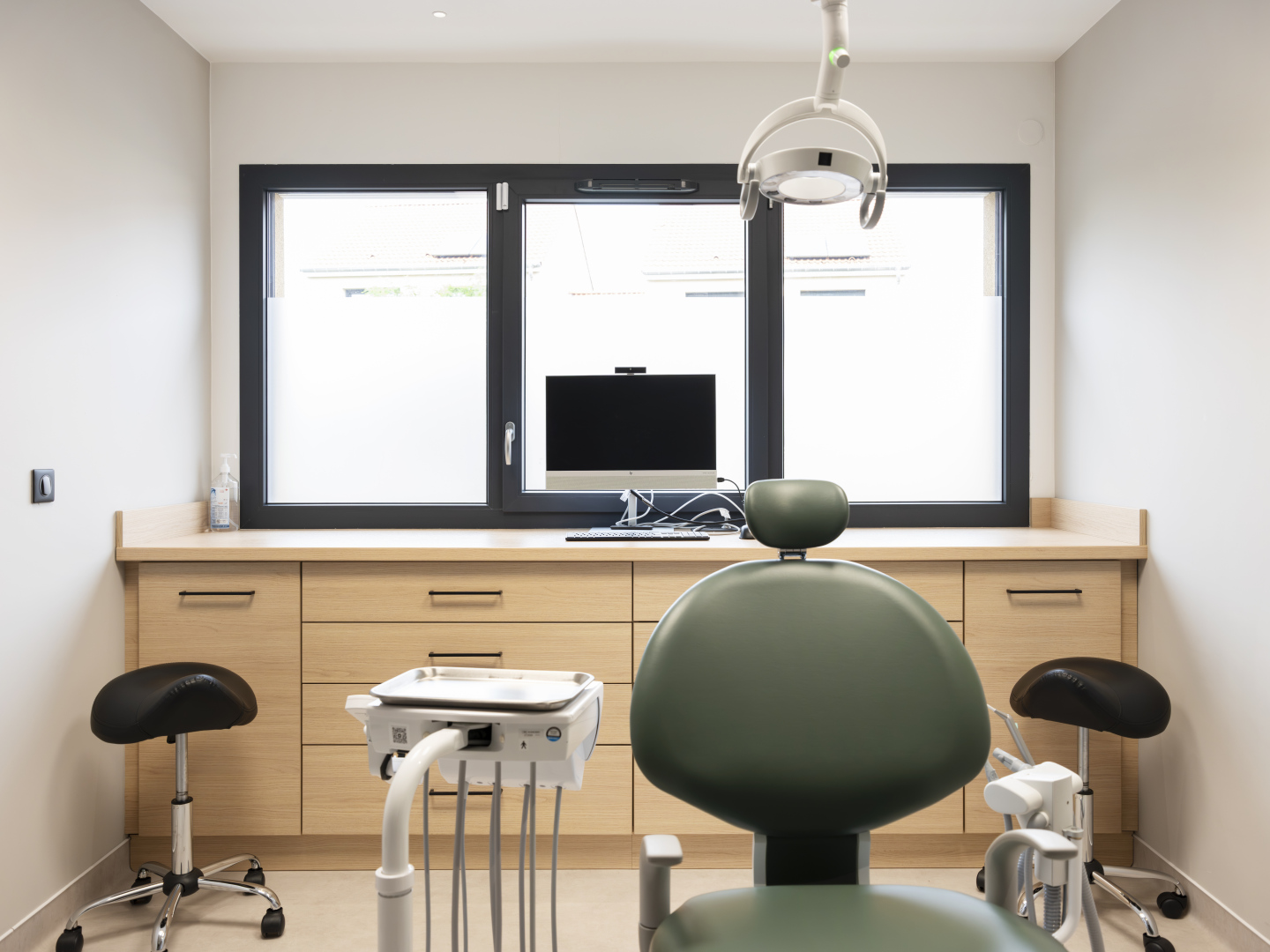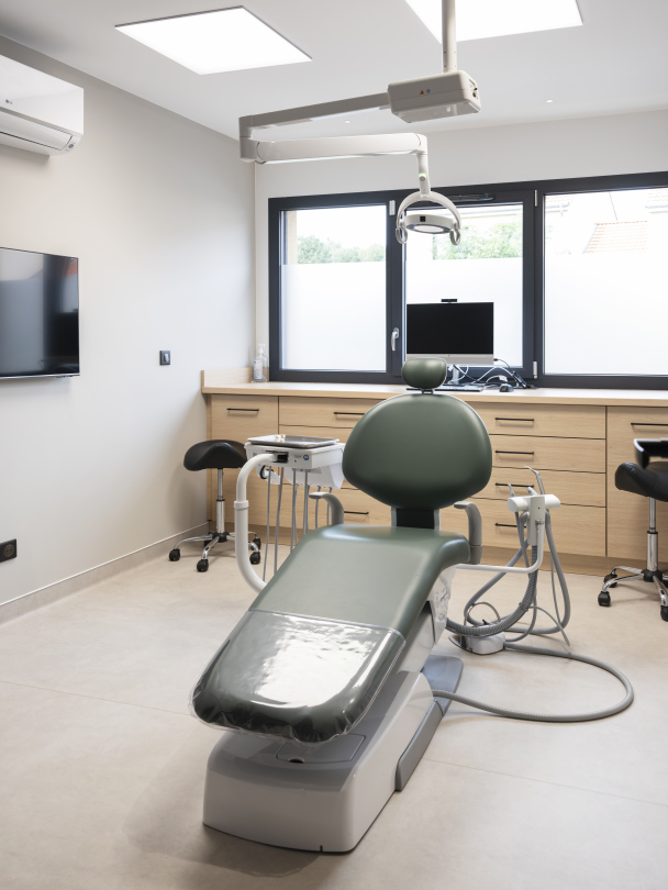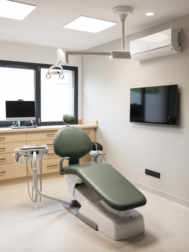 Le cabinet dispose de quatre salles de soins entièrement équipées, intégrant notamment des fauteuils Belmont, reconnus pour leur fiabilité et leur confort, ainsi que des postes informatiques performants et des écrans muraux facilitant le travail des praticiens et la communication avec les patients.